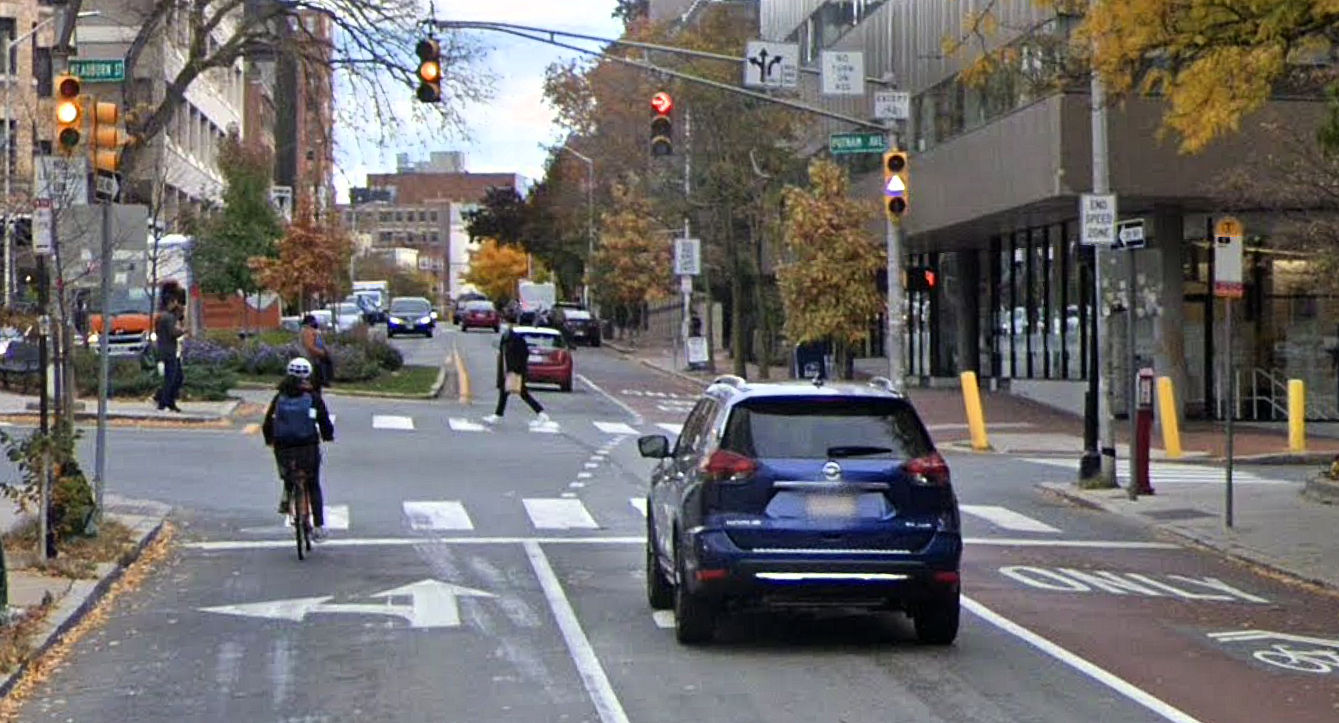 Here’s a closer look at some of the signs and signals. Because bicyclists can legally turn right on red, and use any lane, they can legally turn right from the middle lane in front of buses and other bicyclists. They can also legally turn right from the right-hand lane into the narrow right-hand lane of Putnam Avenue at the same time as motor vehicles are turning right from the middle lane.