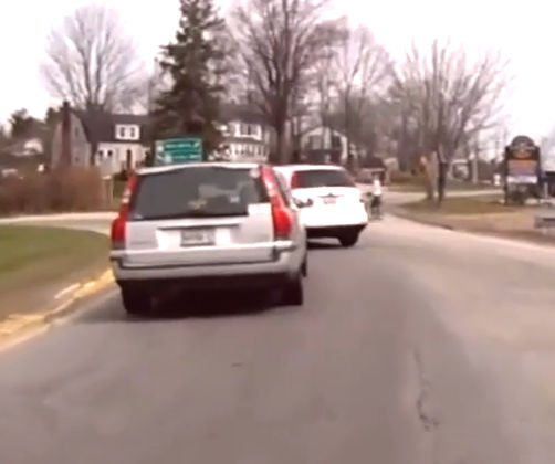 We did not stage this video, and we do not know the identity of the edge rider. A lane-riding CyclingSavvy instructor rode it in preparation for a 2014 course in Portsmouth, New Hampshire. The rotary was a large, older one whose one lane was wide enough for entering and exiting drivers of smaller vehicles to pass to the right of a bicyclist riding near the center island. This rotary is at the Maine end of the Route 1 Bypass that leads from Portsmouth, New Hampshire. (See Wikipedia article.)